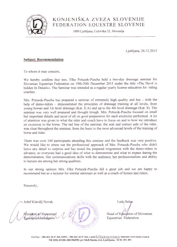 „We hereby confirm that Mrs. Elke Potucek-Puscha held a two-day seminar for Slovenian Equestrian Federation on 19th-20th December 2015 under the title „The Devil is hidden in Details“. The Seminar was intended as a regular yearly license education for riding coaches.