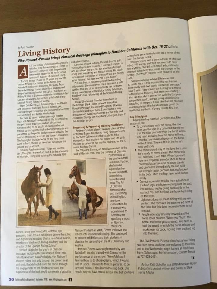 In der September Ausgabe des „California Riding Magazine“ gibt es einen sehr netten Bericht über die Klassische Reitkunst und meinen Kurs im Oktober bei Tressa Boulden-Linsley auf der Traditions Farm in Sebastopol. Den Bericht könnt Ihr auch online lesen. http://www.ridingmagazine.com